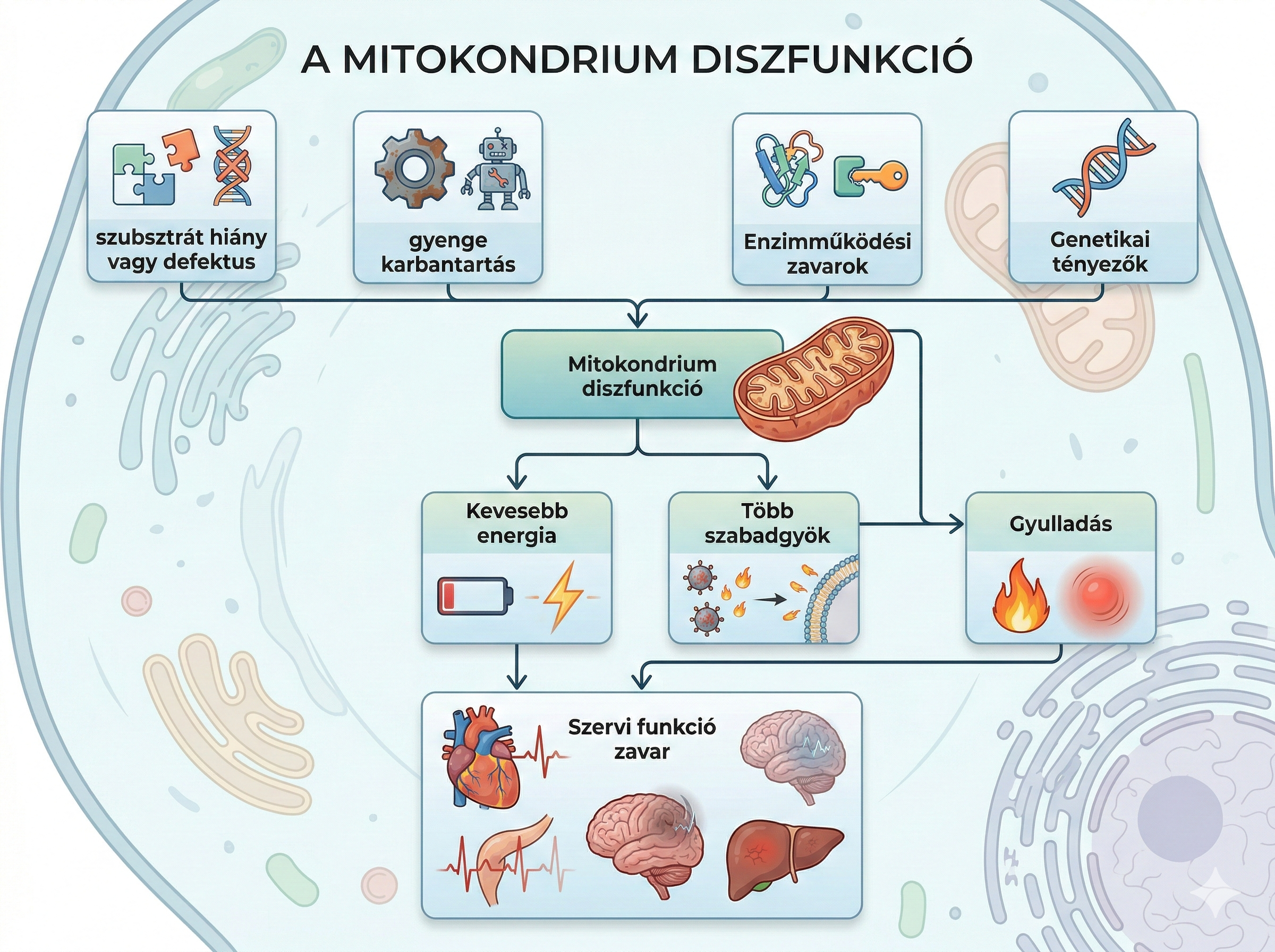 Ha a szervezet ezeket nem tudja megfelelően biztosítani, vagy a mitokondriumok nem képesek őket lebontani és átalakítani, akkor nem tud ATP-t (energiát) előállítani, ami végül energiahiányhoz vezet. Ez a folyamat a szervi diszfunkcióhoz vezető láncreakció egyik legkorábbi és legfontosabb lépcsője. - gyenge karbantartás: Ha az autofágia vagy a mitofágia lassul vagy nem működik elég jól (például tartós stressz, mozgáshiány, túlzott kalóriabevitel vagy öregedés miatt), a sérült mitokondriumok felhalmozódnak. Ez tovább erősíti az energiahiányt és hozzájárul a sejt, majd végső soron a szerv működési zavarához.